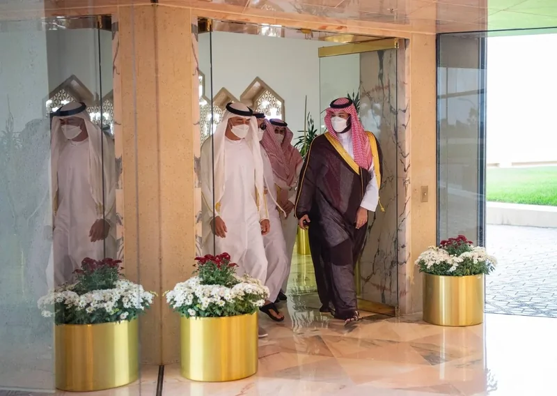 HRH the Crown Prince Prince Mohammed bin Salman receives HRH Crown Abu Dhabi Sheikh Mohammed bin Zayed at his arrival airport the King Khalid international in Riyadh.