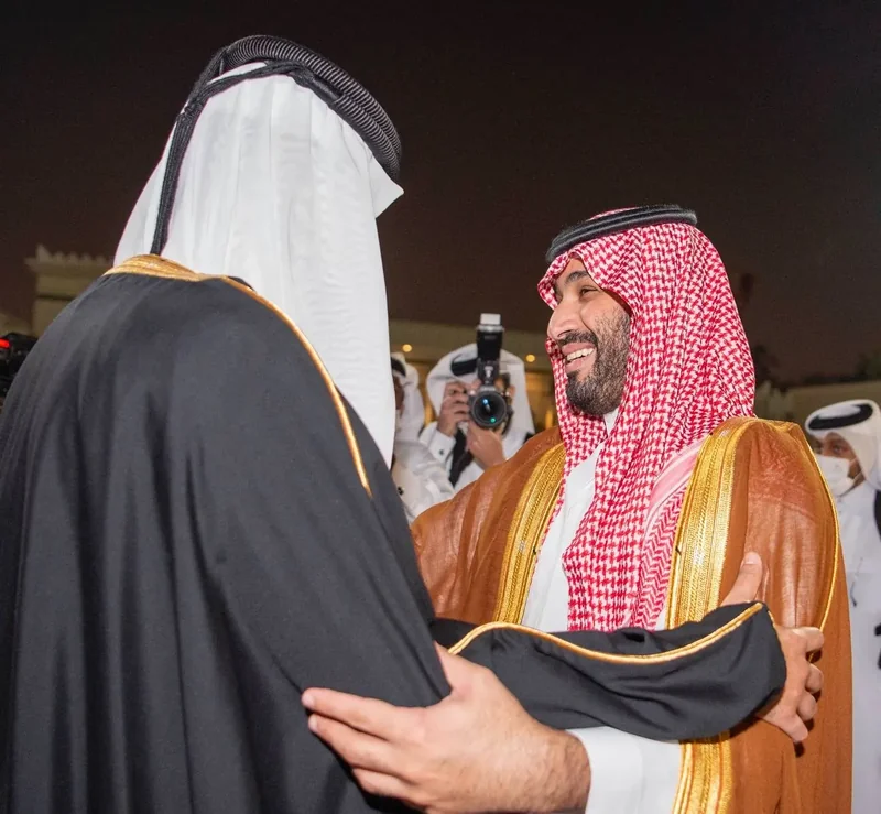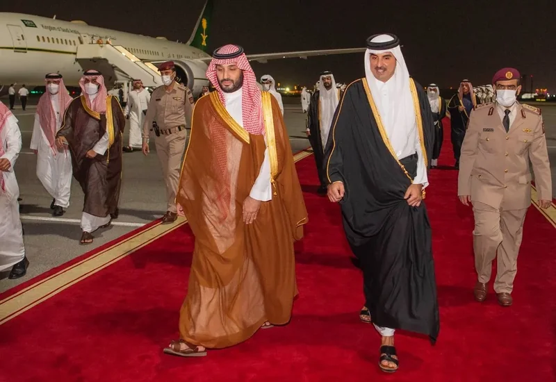 HRH the Crown Prince arrives in the capital Qatari Doha at the forefront of those receiving him HH the Emir of Qatar.